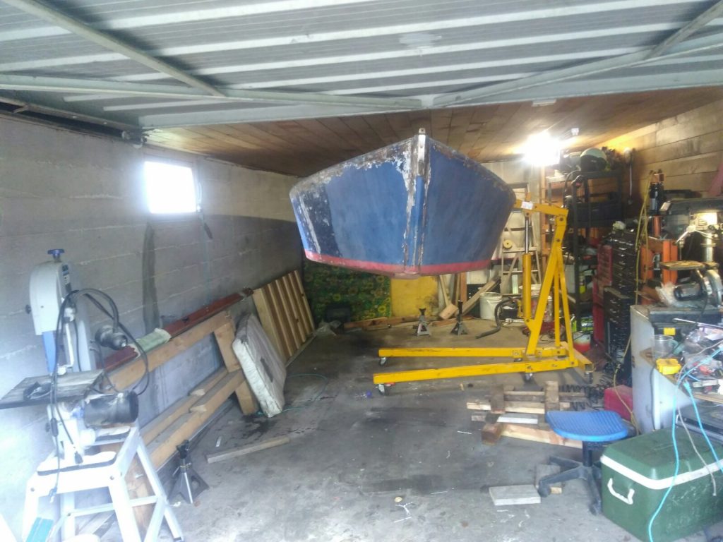 Today, I cut wood for the start of the cabin framing. Most of this i’m doing by eye and measuring only to establish symmetry. First, I had to haul the boat up onto the trailer and get it out of the shop.